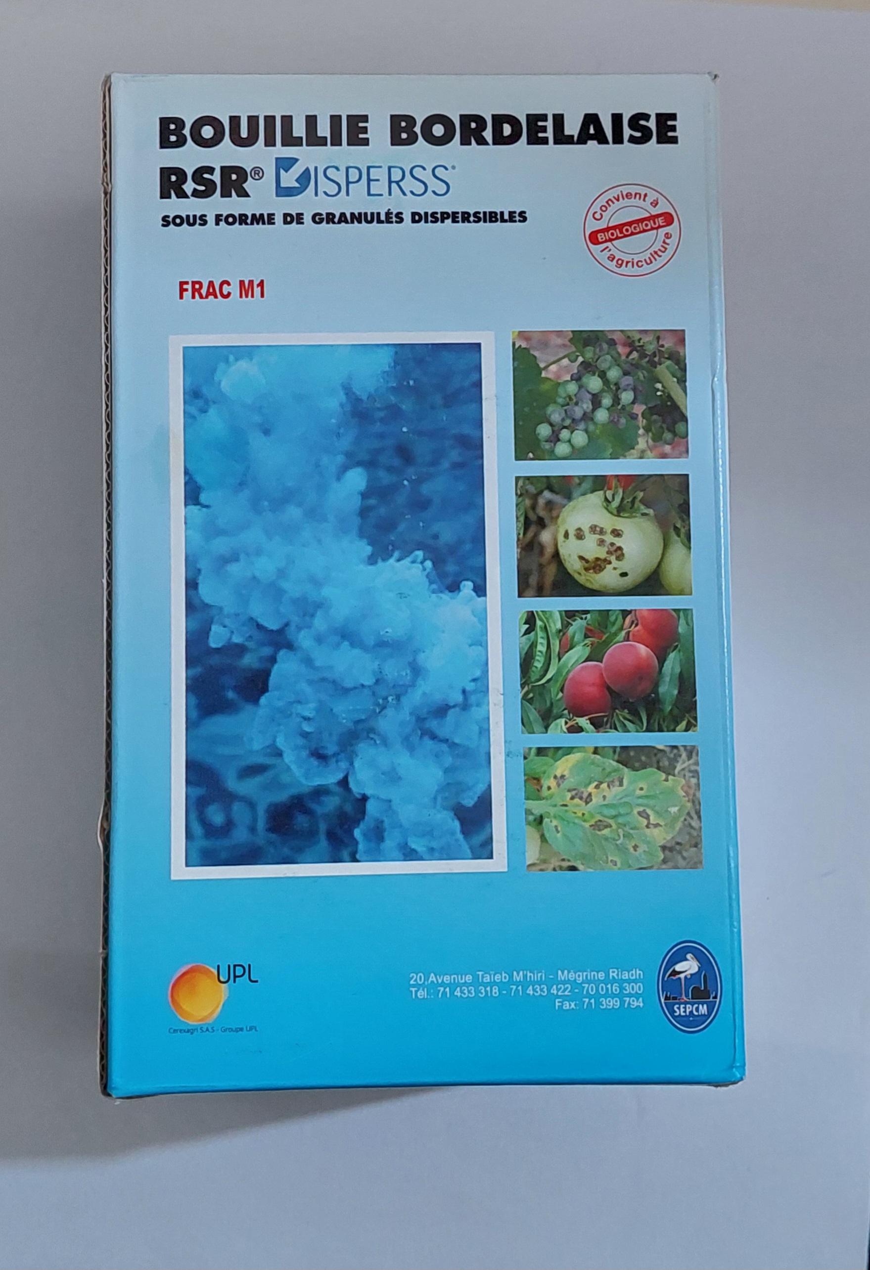 bouillie bordelaise RSR est composée d'un mélange de sels de cuivre; le procédé de fabrication permet de produire la forme la plus active et la plus stable de cuivre métal grâce à la brochantile qui est associée en gypse. granulés dispersibles contenant 20% de cuivre métal sous forme de bouillie bordelaise.